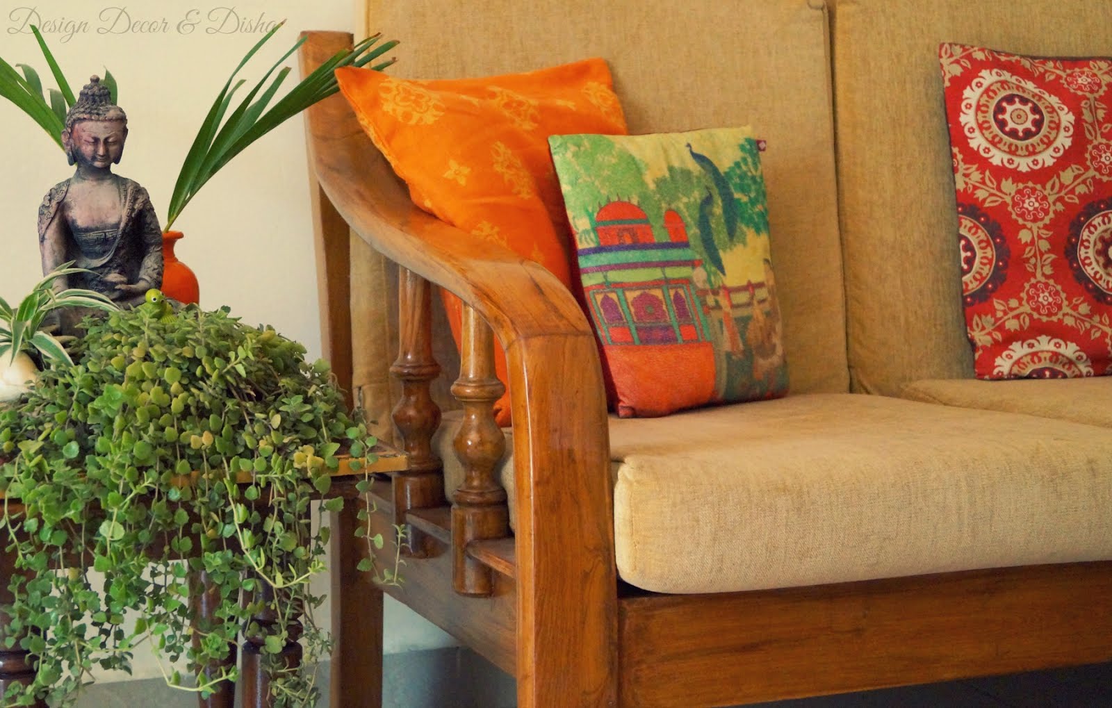 - If you are bored of the same look of your sofa then it's time to change the upholstery and in turn, it will change the look of your place. If you have a wooden sofa with removable cushions/seats then get the covers stitched for the cushions the way I did. There are myriad of colours to choose from and fabric comes in various varieties too like chenille, polyester microsuede, velvet, soft linen, jute, spandex and many others. You can get 2-3 sets of sofa cushion covers in different colours and fabrics and change them when you are bored of the same look or wish to give a quick makeover to your place.
